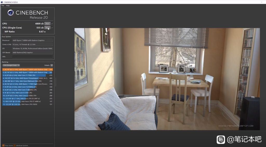 В однопоточном тесте Cinebench R20 результат 8-ядерного 16-поточного процессора Ryzen 7 5800H составил 555 баллов. Для сравнения, настольные решения Ryzen 5 5600X и Ryzen 7 5800X набирают 599 баллов и 629 баллов соответственно. Им чип поколения Cezanne немного уступил, зато 10-ядерный 20-поточный настольный CPU Core i9-10900K с показателем 524 балла остался позади.