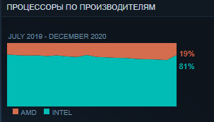 Время от времени можно встретить информацию о высоких продажах процессоров AMD. В такие моменты кажется, что ещё совсем немного и процентная доля Intel упадёт до минимума. На самом деле ничего подобного не происходит, ведь несмотря на все усилия красных, за синими до сих пор 81% рынка. Здесь стоит указать, что следующая информация основана на статистике Steam, но, поскольку больше никаких достоверных сведений у нас нет, то мы будем делать выводы именно на основании данных самого большого игрового магазина.