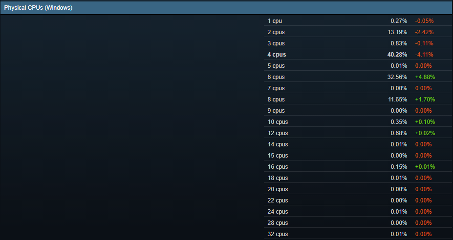 Если обратить внимание на последние тенденции, то становится очевидно желание геймеров обновить устаревший парк компьютеров. Сильнее всего это заметно на 4-ядерных процессорах, потерявших за месяц более 4%. Такая же ситуация и с 2-ядерными камнями, но их и так немного, поэтому прогресс на этом направлении замедлился. Основными выгодоприобретателями стали 6-ядерные (почти 5%) и 8-ядерные (1.7%) камни. Такими темпами к концу 2021 года общее количество 2-ядерных и 4-ядерных процессоров должно снизиться, позволив студиям выпускать игры с более мощными движками.