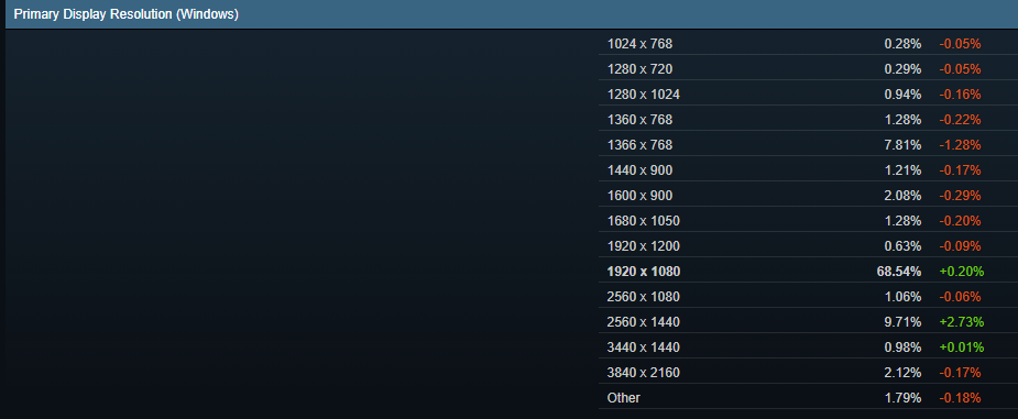 А вот с мониторами всё по-прежнему. 68% рынка за 1080р, что странно, количество подобных дисплеев только растёт. Скорее всего дело в ноутбуках, ведь владельцы старых лэптопов понемногу отказываются от устаревшей техники, переходя на более современные модели. Почти 10% за 2К (1440р), а хвалёное 4К (2160р) так и не смогло завоевать сердца геймеров.