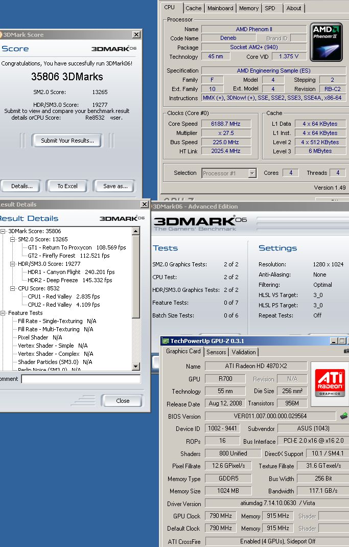 Последняя удачная попытка разгона зафиксировала частоту процессора 6189 МГц, видеокарты были разогнаны до 902/3760 МГц. Результат в 35 806 "попугаев" 3DMark'06 стал новым мировым рекордом. Видеокарты способны разогнаться сильнее, так что рекорд может быть побит в ближайшие дни.