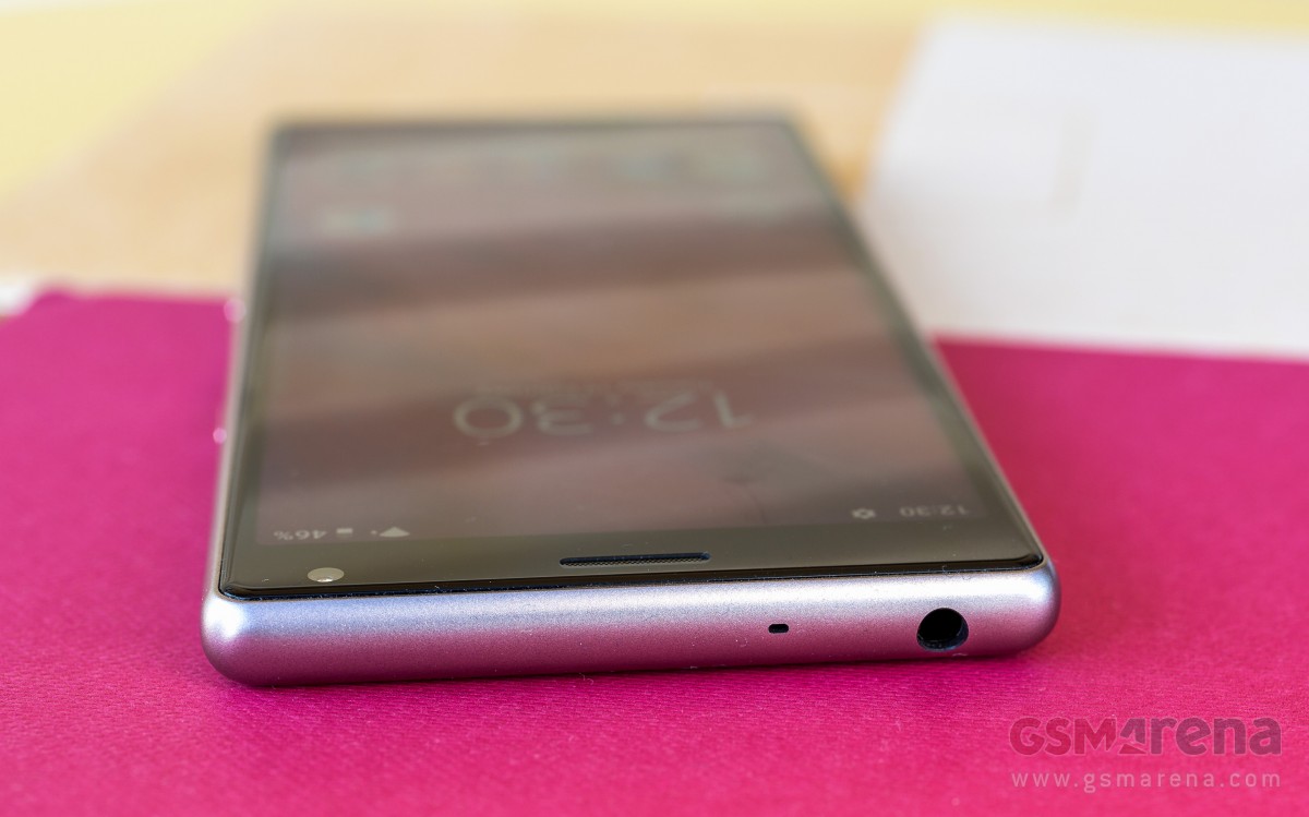 Спереди в Sony Xperia L3 в глаза бросаются широкие рамки сверху и снизу. При этом подбородок уже по традиции не содержит никаких элементов. В нижний торец разработчики вынесли USB-C и решетку мультимедийного динамика. Вверху оказался разъем для наушников.