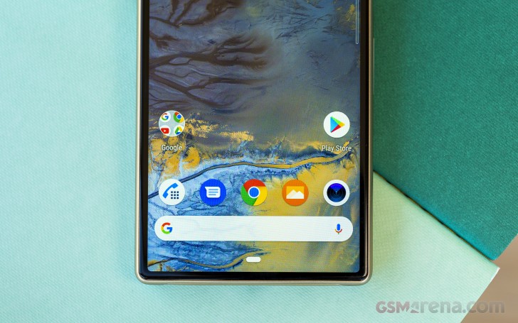 На экране смартфона нет выреза, зато есть довольно широкая рамка наверху. С таким соотношением сторон смартфон получился длиннее большинства конкурентов.