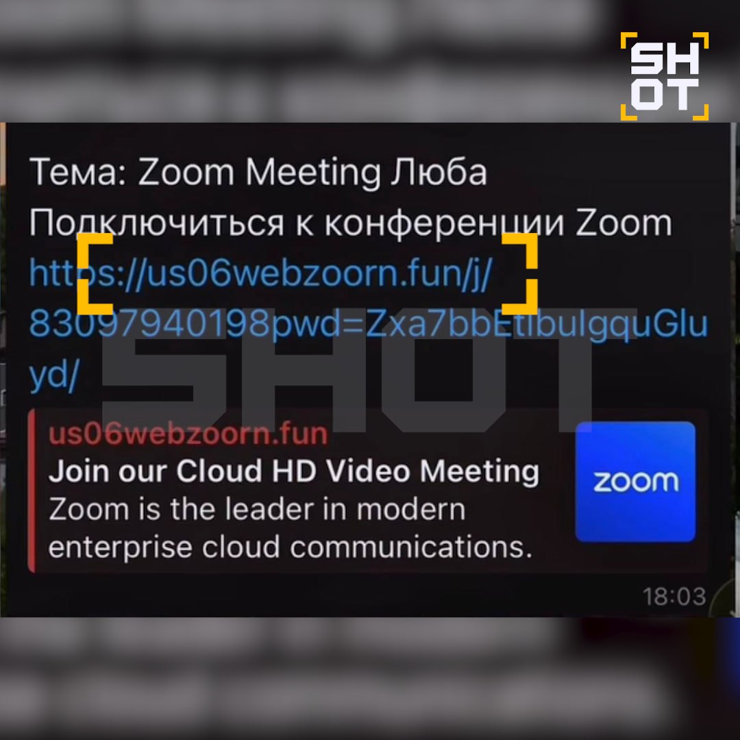 Это обсуждение предлагается вести в сервисе Zoom, для чего присылается ссылка для активации видеозвонка. Жертвы могут не разглядеть, что в слове Zoom вместо буквы m используются две буквы r и n, которые рядом друг с другом почти не отличаются от m. После перехода по этой фальшивой ссылке жертва попадает на фишинговый сайт в стиле настоящего интерфейса Zoom.