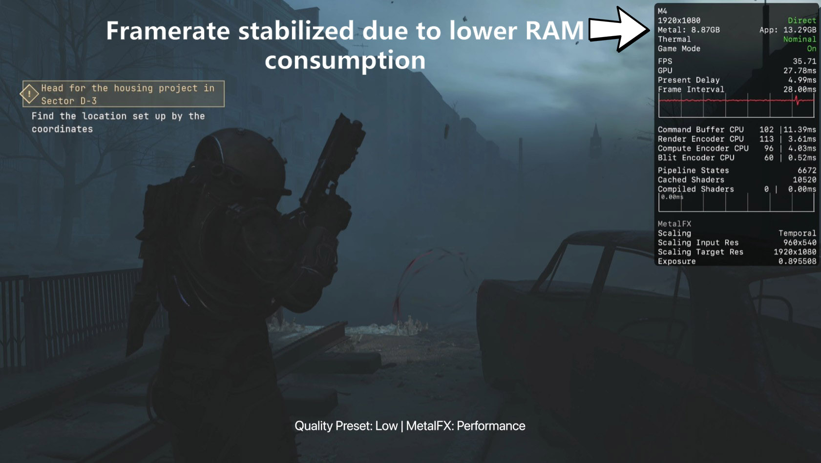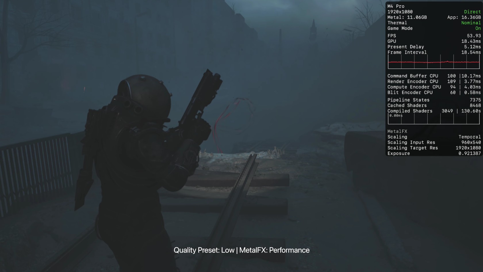 Cronos: The New Dawn базируется на движке Unreal Engine 5 и имеет официальный нативный порт под macOS. Хотя в игре реализована технология масштабирования MetalFX, это не спасает, и даже при низких настройках актуальный Apple M4 не обеспечивает плавности геймплея.