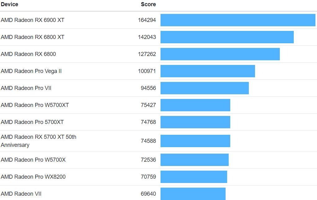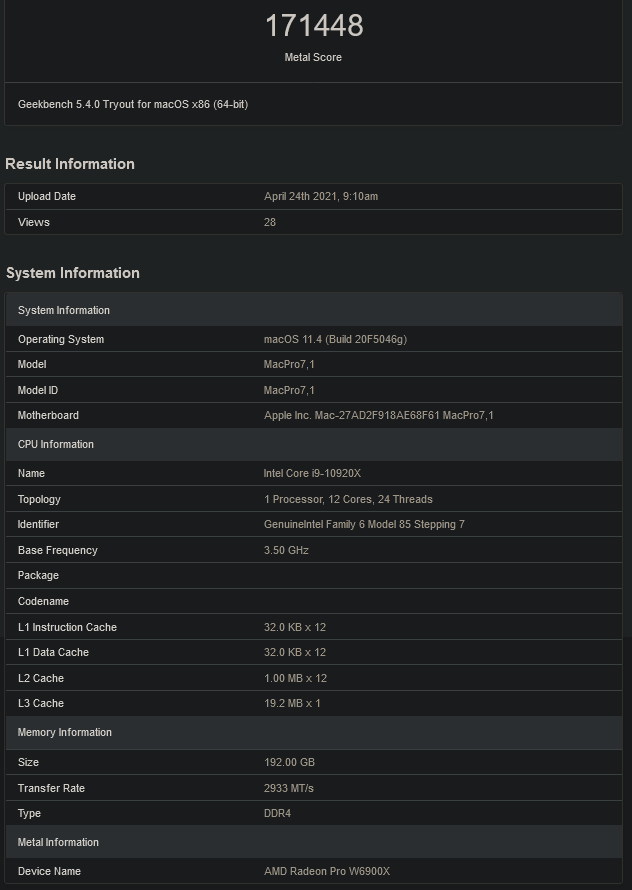 Geekbench сообщает, что тестирование новой модели производилось на Mac Pro 7.1 на базе 12-ядерного центрального процессора Intel Core i9-10920X совместно с впечатляющим 192 ГБ оперативной памяти стандарта DDR4-2933. Согласно данным портала Videocardz, общие результаты Geekbench для графического процессора помещают профессиональную модель между игровыми решениями Radeon RX 6800 XT и RX 6900 XT. Однако в тестах Metal API графический процессор Pro W6900X смог набрать 171 448 баллов, что заметно больше, чем результат 164 294 баллов, полученный RX 6900 XT. Это может указывать на больший объем локальной памяти на версии Pro, возможно, около 32 ГБ.
