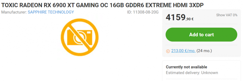 Radeon RX 6900 XT Toxic Extreme с установленным графическим процессором Navi 21 XTXH и более высокими тактовыми частотами, чем у обычной модели Toxic, поступила в продажу в Европе по цене от 2599 до 4160 евро. Это значительно больше, чем рекомендованные 1000 евро, которые установлены производителем за обычную модель Radeon RX 6900 XT. Стоимость превышает рекомендованную от двух с половиной до четырех раз.