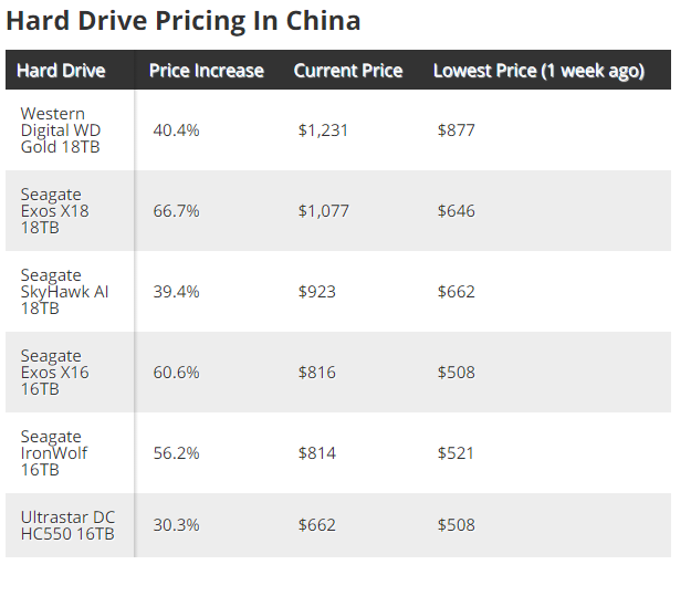 Однако, рост стоимости жестких дисков всё же постепенно набирает обороты. Портал Tomshardware опубликовал таблицу, которая показывает, насколько выросли цены за последнюю неделю на некоторые жесткие диски в Китае: