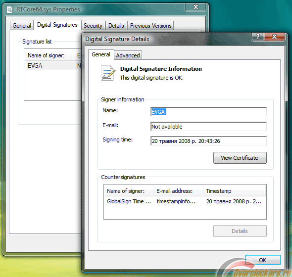 Однако на помощь пришла новинка под названием EVGA Precision. Оказалось, что утилита для разгона видеокарт основана все на тех же компонентах, что и RightMark Clock Utility, хоть и предназначена совершенно для других задач. В ее состав входит тот же драйвер RTCore64.sys, однако уже с цифровой подписью, что позволяет без проблем пользоваться вышеуказанной утилитой мониторинга и управления процессором в среде Windows Vista архитектуры х64.
