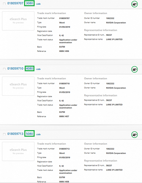 Приближается Computex 2019, и NVIDIA пытается привлечь внимание любителей видеокарт провокационными видеороликами, поскольку подобная тактика была опробована в прошлом году. Готовится она к выпуску новых продуктов и в юридическом плане. На сайте EUIPO, например, первого мая этого года были обнаружены три новых заявки на регистрацию торговых наименований "5080", "4080" и "3080", в качестве правообладателя упоминается NVIDIA Corporation.