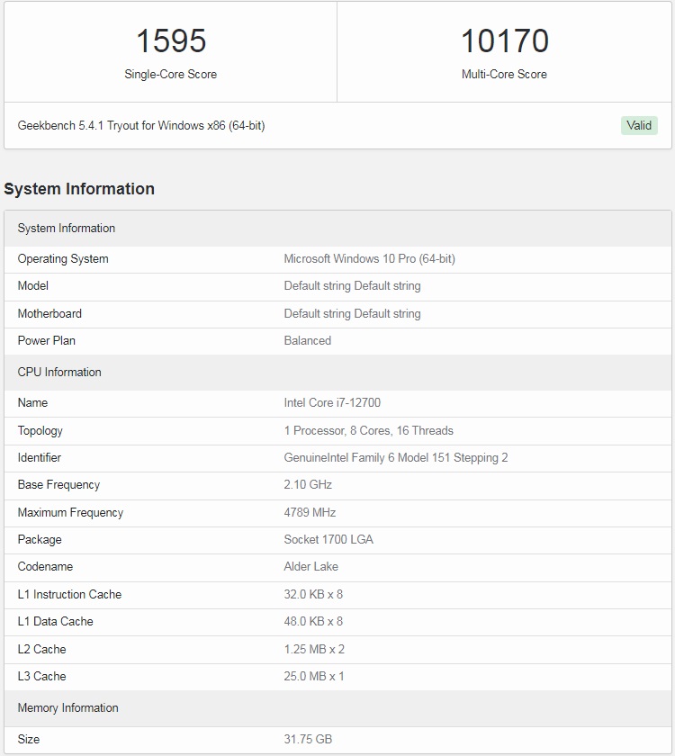Согласно представленным данным, десктопный процессор Intel Core i7-12700, получивший в своё распоряжение 8 ядер/16 потоков, функционирующих на базовой частоте 2,1 ГГц с повышением до 4,8 ГГц в максимальном режиме, в однопоточной дисциплине смог набрать 1595 баллов, а в многопоточном подтесте новинке покорился результат в 10170 очков.