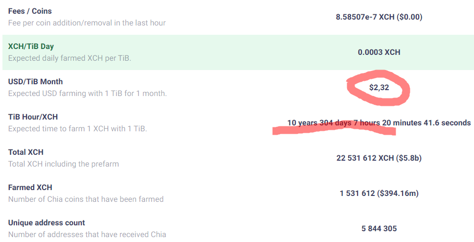 5 накопителей по 18 Гб дают нам 90 Тб. Согласно официальным данным, 1 Тб генерирует 2.32 доллара в месяц. Это значит, что наша ферма будет зарабатывать 209 долларов за 30 дней. Если разделить сумму вложений в 3500 долларов на ежемесячную прибыль, то получается, что мы сможем отбить вложения за 17 месяцев. А ведь нам обещали совсем другую перспективу. На самом деле всё куда хуже, ведь с каждым месяцем сложность майнинга Chia Coin растёт. К примеру, за месяц данный показатель увеличился на 15-20%. Если включить в наше уравнение переменную усложнения, то выходит, что вернуть вложения получится не ранее, чем через 2 года. Может быть, если вся эта афера будет продолжать существовать в 2023 году.