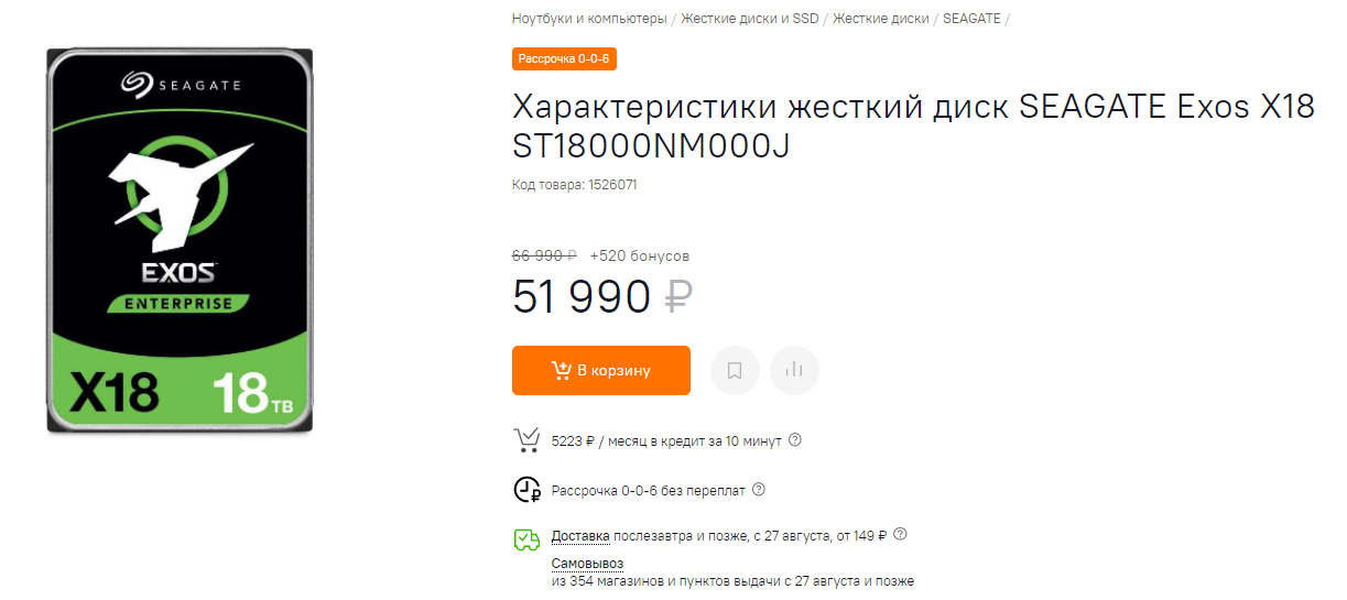 Предположим, что мы собираем ферму на домашнем компьютере. При этом у нас уже есть обычный системный блок, на котором мы продолжим работать в штатном режиме. Поскольку мы не миллионеры, а материнская плата самая обычная, в неё помещается 5 жёстких дисков. Так как мы хотим получить оптимальную эффективность берём 5 SEAGATE Exos X18. Данный накопитель обладает просто невероятным количеством времени на отказ (2.5 миллиона часов), что делает его идеальным инструментом для фарминга. 5 таких жёстких дисков обойдётся вам в 260 000 рублей (52 000 за единицу), что равняется 3500 долларам на момент написания материала.