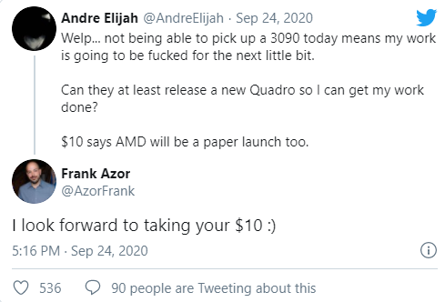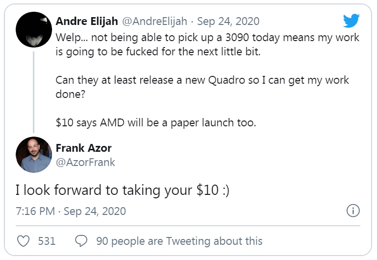 Стоит напомнить, что несколько часов в ответ на сообщение одного из энтузиастов, утверждающее, что запуск графических адаптеров Radeon RX 6000, подобно продуктам NVIDIA серии GeForce RTX 30, тоже будет «бумажным», и предлагающее пари, победителю которого достанется целых $10, главный архитектор игрового подразделения AMD Фрэнк Азор (Frank Azor) заявил, что ему уже не терпится забрать эту сумму.
