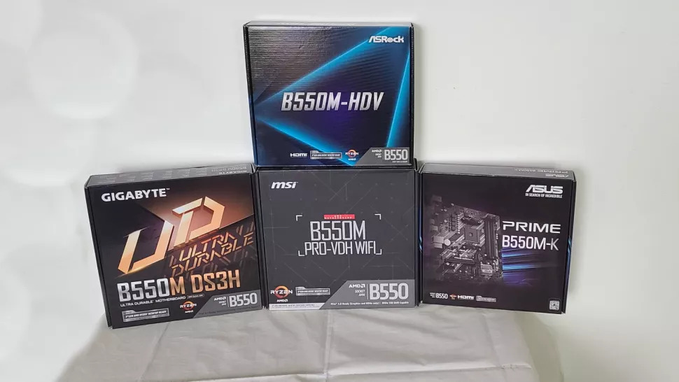 Здесь представлены 4 недорогие материнские платы AMD B550 в форм-факторе MicroATX для использования с флагманским процессором AMD Ryzen 9 3900X. В частности рассмотрены ASRock B550M-HDV за 81 доллар, Gigabyte B550M DS3H за 95 долларов, MSI B550M Pro-VDH Wi-Fi за 110 долларов и самая дорогая - Asus Prime B550M K за 121 доллар. В этих платах отсутствуют многие привычные аксессуары такие, как RGB-освещение, кожухи и радиаторы на некоторых элементах, а также повышенная подача питания.