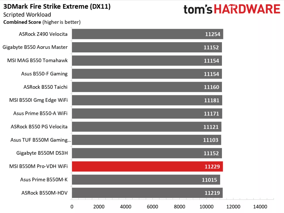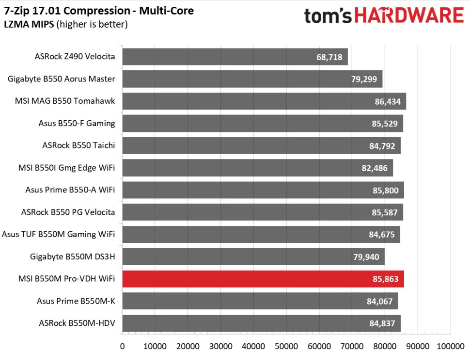 Что касается памяти, все платы с четырьмя слотами DIMM были стабильны со стороны памяти и могли работать с DDR4 3600 4x8 ГБ с использованием профиля XMP. В результате тестов все системные платы, за исключением самой дешевой ASRock B550M-HDV, смогли управлять мощным процессором на стандартных скоростях практически при любой нагрузке. И только MSI B550M Pro-VDH Wi-Fi (109,99 долларов) после разгона оказалась способной управлять всеми 12 ядрами/24 потоками на 4,3 ГГц во время стресс-теста без троттлинга. Эта плата также показала лучшие общие результаты в тестировании, а также дольше поддерживала стабильные тактовые частоты.