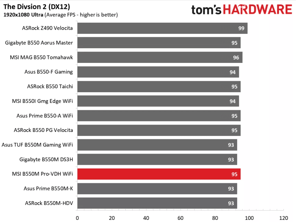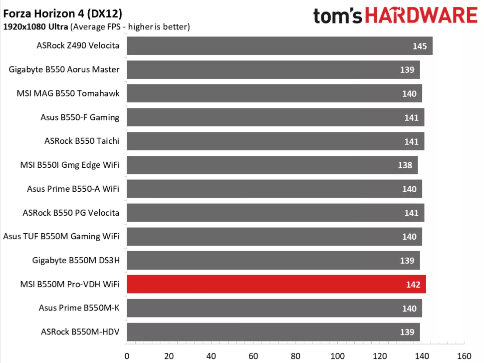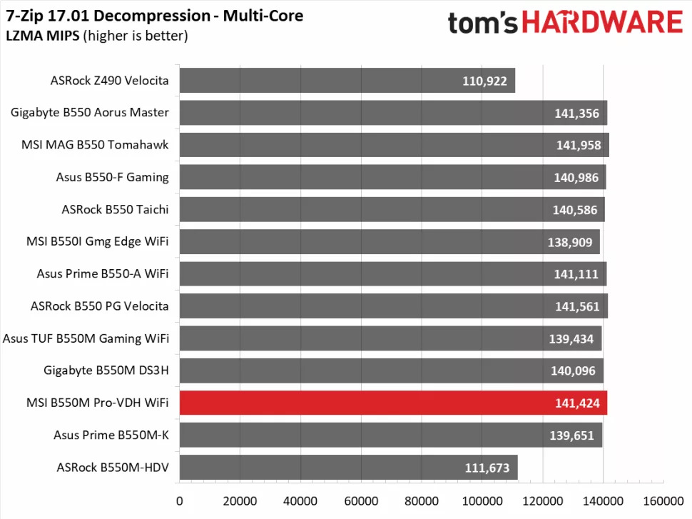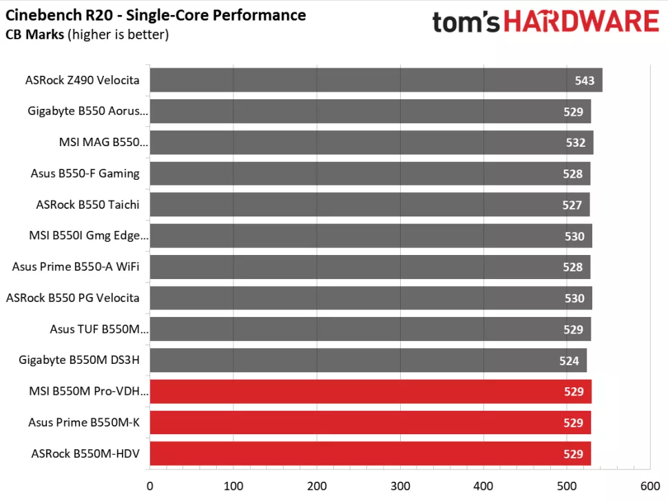 Для этого обзора диаграммы включают все протестированные материнские платы на базе B550. Красная полоса указывает на самую быструю/лучшую производительность из четырех бюджетных плат, которые рассмотрены здесь.