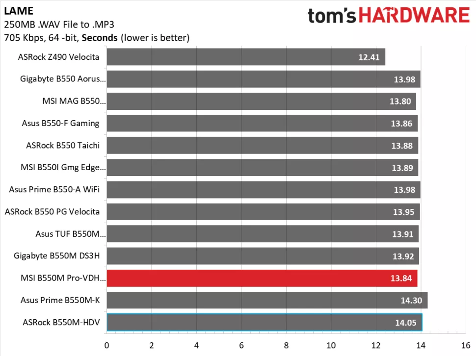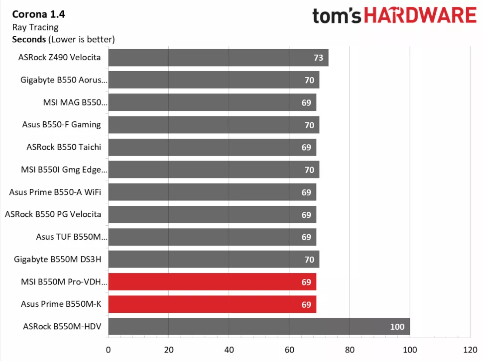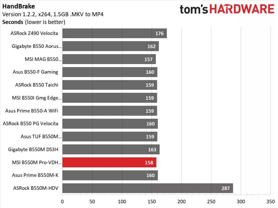 Во время тестирования Timed Applications LAME все платы были близки, за исключением Prime B550M-K, которая работала медленнее других. В более тяжелых тестах Corona и Handbrake ASRock был значительно медленнее, чем все остальные. Плата ASRock не может справиться с нагрузкой в этих приложениях без значительного троттлинга.