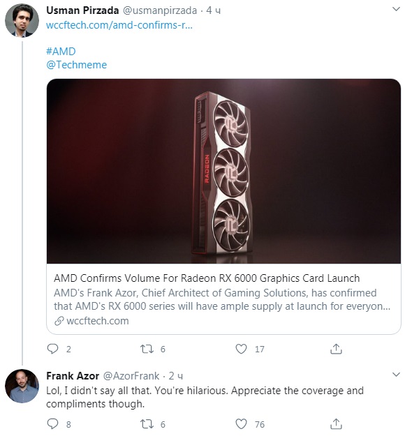 Естественно, слова представителя AMD интерпретировали в том ключе, что компания обеспечит достаточные запасы видеокарт с архитектурой RDNA 2 на старте продаж, однако после выхода статьи ресурса Wccftech Фрэнк Азор сообщил, что его слова не совсем верно поняли, заявив, что он ничего не утверждал.