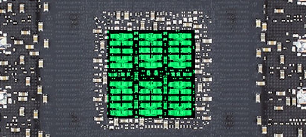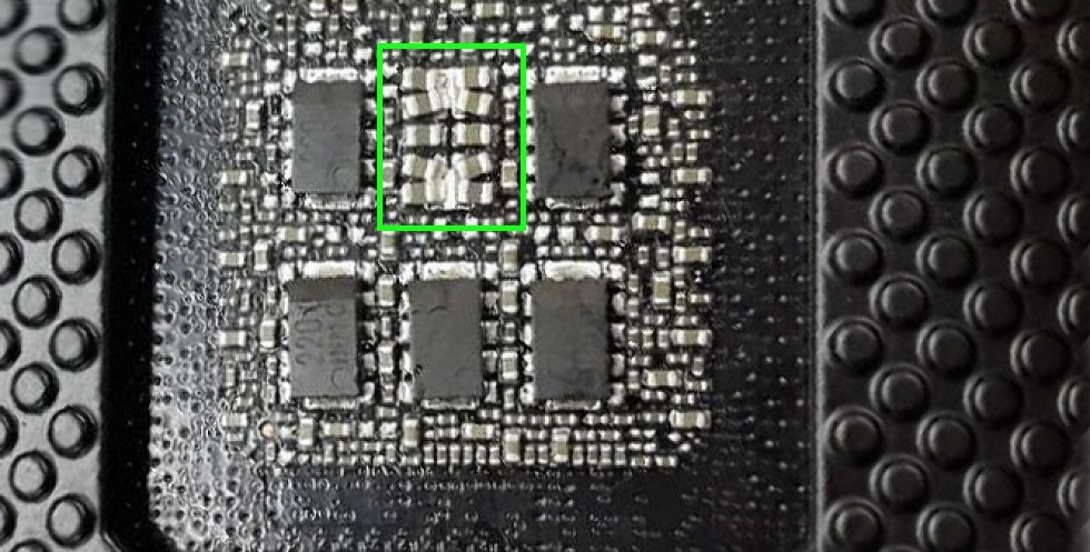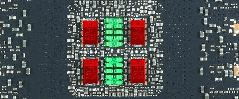 Однако более весомым фактором, судя по всему, стала экономия на компонентах ряда производителей: так, согласно спецификациям, для фильтрации высоких частот на шинах напряжения допускается использование как дорогих и более качественных многослойных керамических конденсаторов (MLCC, обозначены зелёным), так и более дешёвых танталовых твердотельных (POSCAP, обозначены красным).