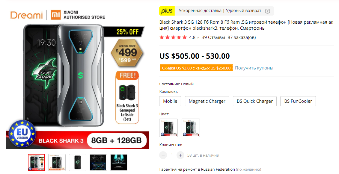 Ещё больше сэкономить можно на покупке Black Shark 3 в топовой модификации. Она появилась на рынке с ценником 850 долларов (729 евро). По акции стоимость уже упала до 600 долларов, а промокод TREND3000 или 3000TREND даст возможность снизить стоимость почти до 550 долларов. За эти деньги игровой смартфон предлагает 12 ГБ оперативной памяти в паре с постоянным запоминающим устройством ёмкостью 256 ГБ. Специальное предложение будет действовать менее суток. Акция завершается завтра, 26 сентября, в 9:59 по Московскому времени.