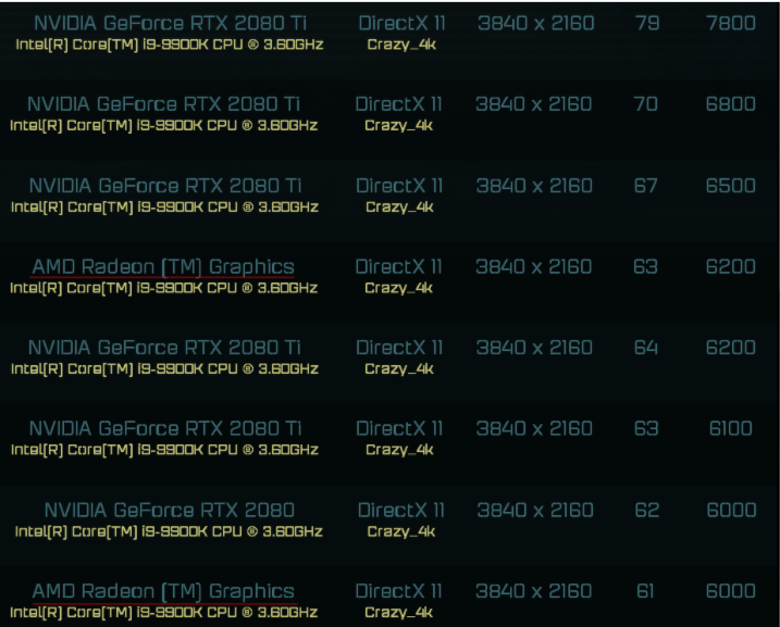У себя на странице в Twitter инсайдер с ником TUM_APISAK опубликовал результаты недавнего теста. В нём новинка AMD под простым кодовым названием AMD Radeon Graphics набрала 6 200 баллов. Примерно столько же получила и RTX 2080 Ti. Никаких данных по поводу старших моделей нового поколения AMD нет, но ясно, что для конкуренции с Nvidia им понадобится хотя бы аналогичная мощность.