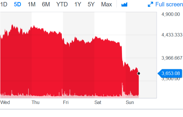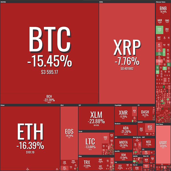 Основные криптовалюты снова рухнули. Вечером в субботу биткоин пробил отметку в $4000 и теперь торгуется в окрестности $3600, хотя не исключено, что это далеко не нижняя точка. За последние десять дней это третье подряд падение курса на двузначное число процентов, в результате чего с начала месяца основная криптовалюта подешевела на 43 %. Более того, сейчас биткоин стоит дешевле, чем когда-либо в этом году, причём, если сравнивать с пиками начала 2018, то его стоимость упала в четыре с половиной раза.