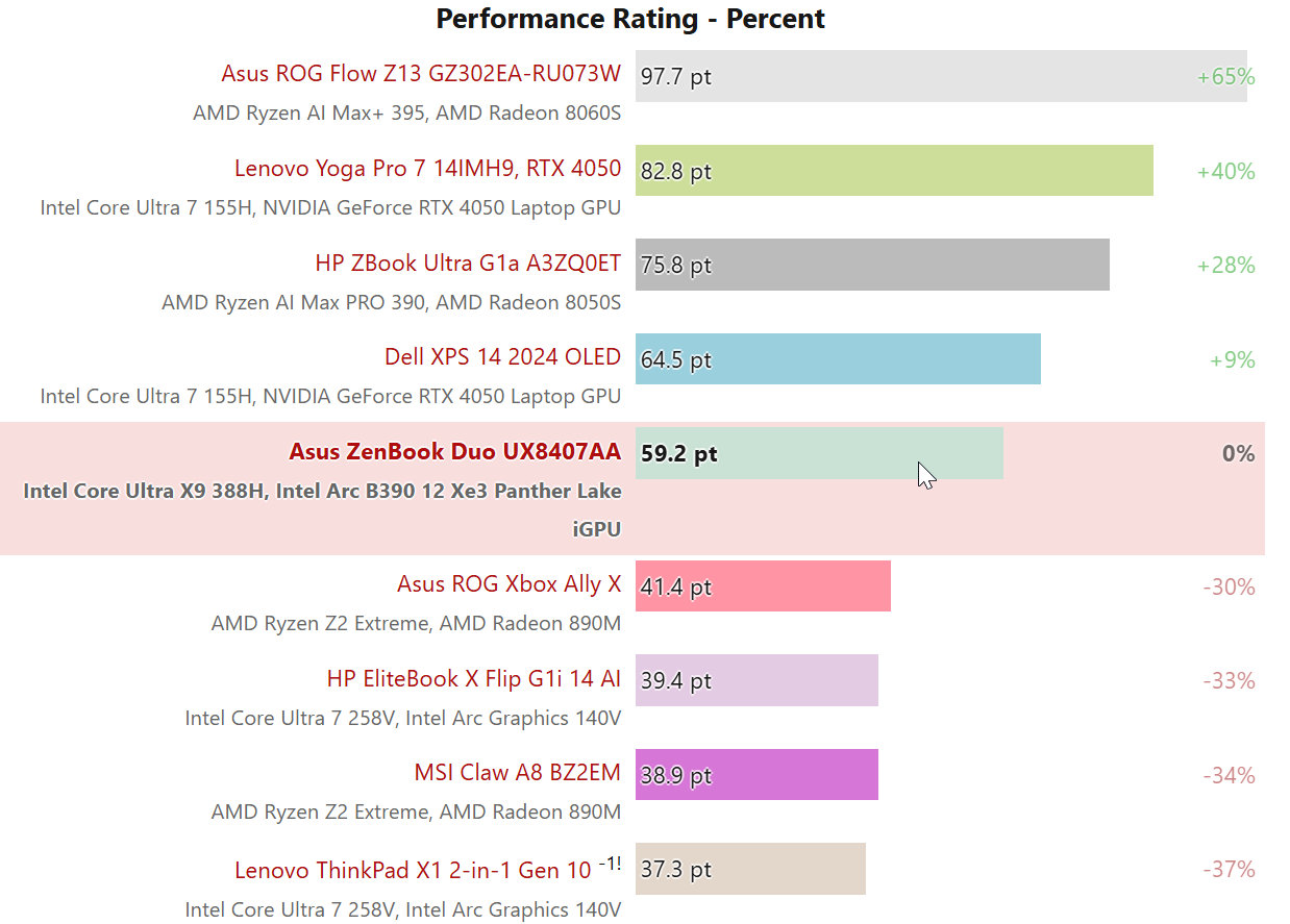 В нескольких тестах Notebookcheck интегрированная графика Arc B390 показывает результаты, близкие к показателям маломощных версий RTX 4050 для ноутбуков, и значительно превосходит Arc 140T, Arc 140V, Radeon 890M. Интегрированная графика AMD Strix Halo всё ещё быстрее, но эти гибридные процессоры потребляют гораздо больше энергии.