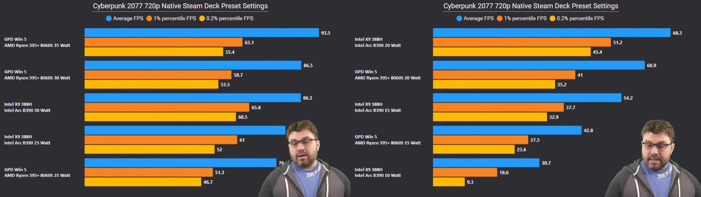 YouTube-блогер Phawx уделяет больше внимания сценариям с ограниченным энергопотреблением. При одинаковом энергопотреблении в диапазоне от 10 Вт до 35 Вт интегрированная Arc B390 превосходит Radeon 890M, включая игры с низкими настройками графики, и предсказуемо остаётся в лидерах при энергопотреблении выше 20 Вт. Аналогичные результаты показаны в обзоре YouTube-канала Hardware Canucks.