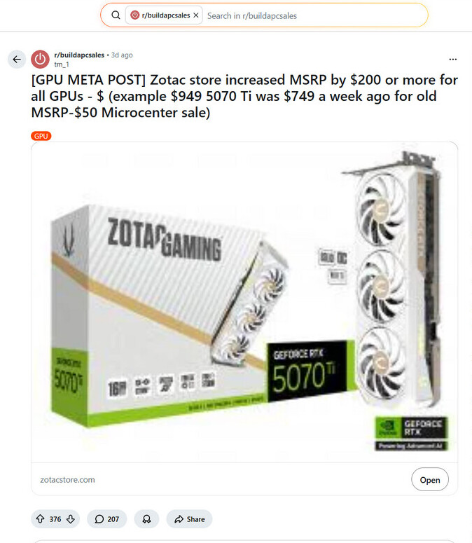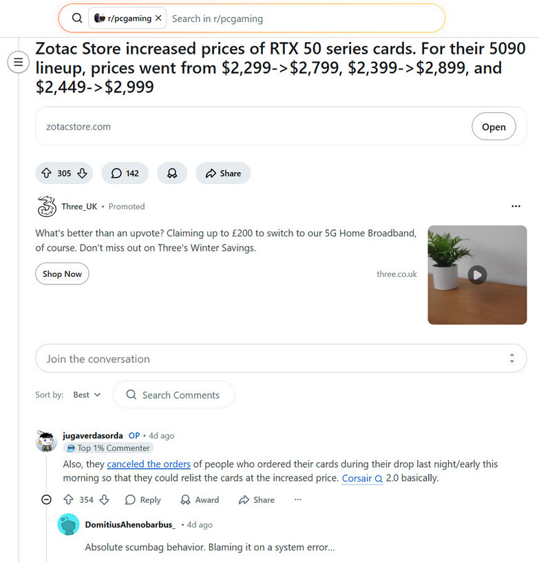 Предполагаемое прекращение действия программы NVIDIA Open Price Program (OPP) вызвало первые последствия, затронувшие покупателей кастомных видеокарт GeForce RTX 50. С момента появления первых сообщений в конце прошлой недели в онлайн-сообществах, посвященных компьютерному оборудованию, распространились негативные отзывы. Пользователи выразили свое недовольство после покупки продукции ASUS и Zotac, при этом много критики было направлено в адрес предполагаемых действий последней в конце января. Завершение программы OPP имеет серьезные последствия для партнеров NVIDIA, поскольку они продолжают испытывать трудности в условиях серьезного кризиса поставок памяти, усугубляемого якобы сокращением поставок графических процессоров. Закрытие программы фактически прекращает субсидирование, это приводит к ожиданию того, что производители переложат затраты на обычных потребителей. В одном из разделов "PC Gaming subreddit" особое внимание было уделено официальному североамериканскому интернет-магазину компании Zotac. Автор отследил цены на видеокарты RTX 5090, достигшие отметки в 2999 долларов, и цену на модель RTX 5080, которая установилась на уровне 1249 долларов, по сравнению с предыдущими 999 долларами.