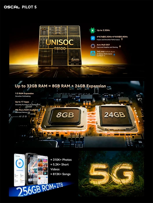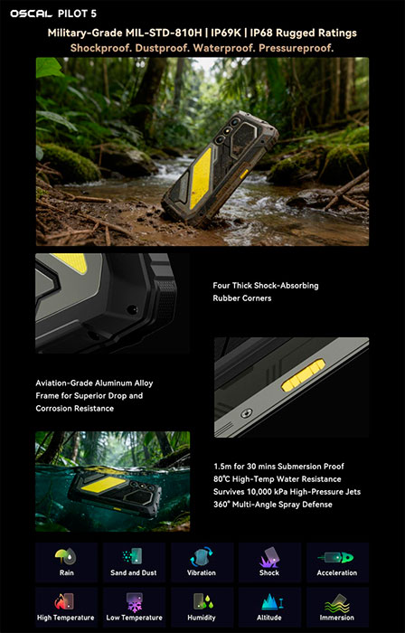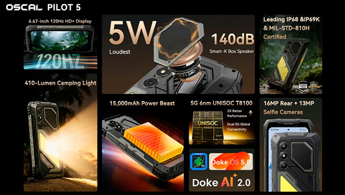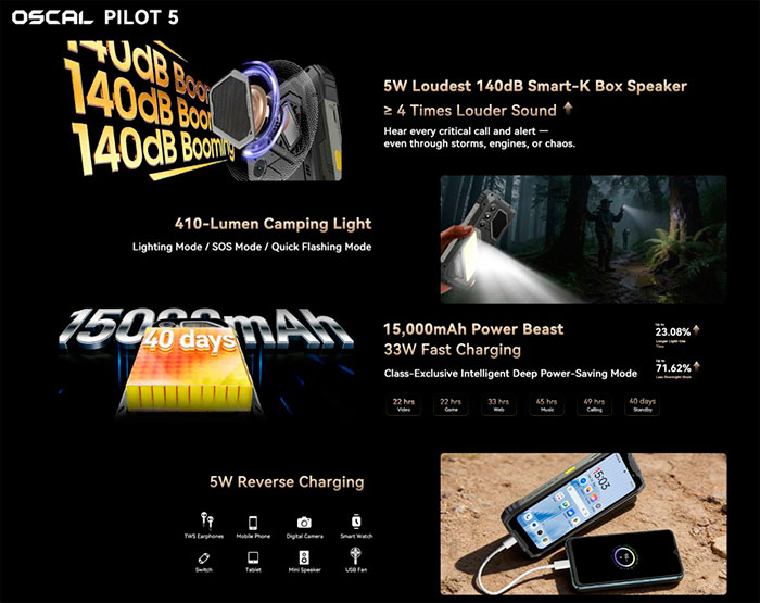 Известная своими защищёнными мобильными устройствами компания OSCAL предлагает поклонникам устройств подобного рода свою очередную модель. Отличительной чертой аппарата PILOT 5 является динамик громкостью 140 дБ, который будет слышен за много километров на природе, позволяя спасателям обнаружить обладателя устройства, если он попадёт в неприятности. Также подобная громкость способна отпугнуть от лагеря диких животных и защитить любителей путешествий. Полезен он будет и на шумных строительных площадках, позволяя расслышать собеседника.