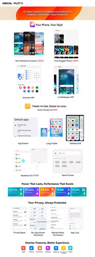 Устройство работает под управлением Android 16 с программной оболочкой Doke OS 5.0. Она оптимизирована для работы на открытом воздухе и предлагает повышенную на 18,54% скорость отклика, ускоренный запуск приложений и переключение между ними. Продолжительность работы устройства в дневное время выросла на 23,08%, в режиме ожидания ночью расход энергии сокращён на 71,62%.