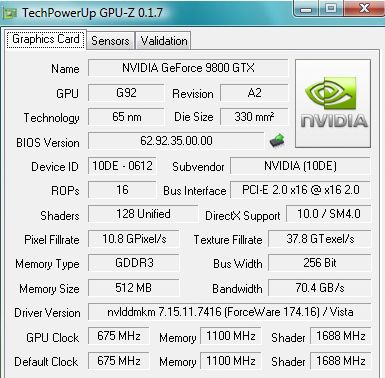 Начнём с изучения скриншота. Подтверждаются частоты видеокарты - они равны 675/1688/2200 МГц. По сравнению с GeForce 8800 GTS 512 Мб, частота ядра выросла всего на 25 МГц, память прибавила побольше - 260 МГц DDR. Сообщается, что видеокарта снабжается памятью типа GDDR-3 со временем выборки 0.8 нс. Ядро G92 принадлежит к той же ревизии A2, что и в случае с GeForce 8800 GTS 512 Мб.
