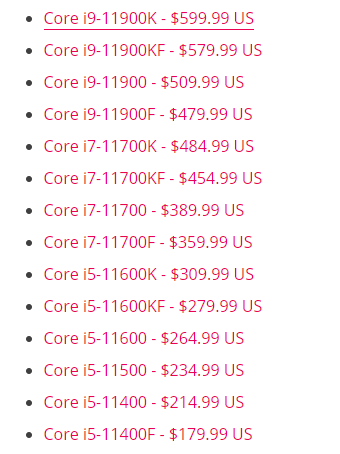 Новый Core i9-11900K оценён в 600 долларов, а бюджетный Core i5-11400 в немыслимые 215 долларов. А ведь даже у нас Core i5-10400 стоит 14 000 рублей, что по курсу не больше 189 долларов. Точно такая же ситуация и с другими представителями 11-го поколения.
