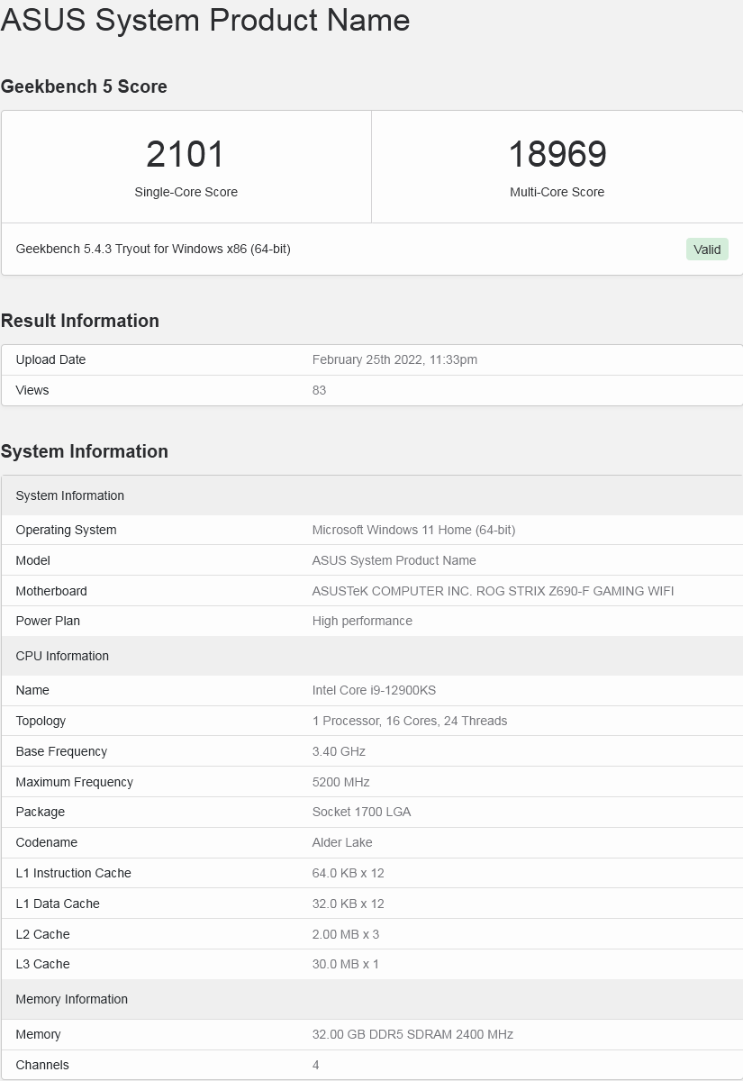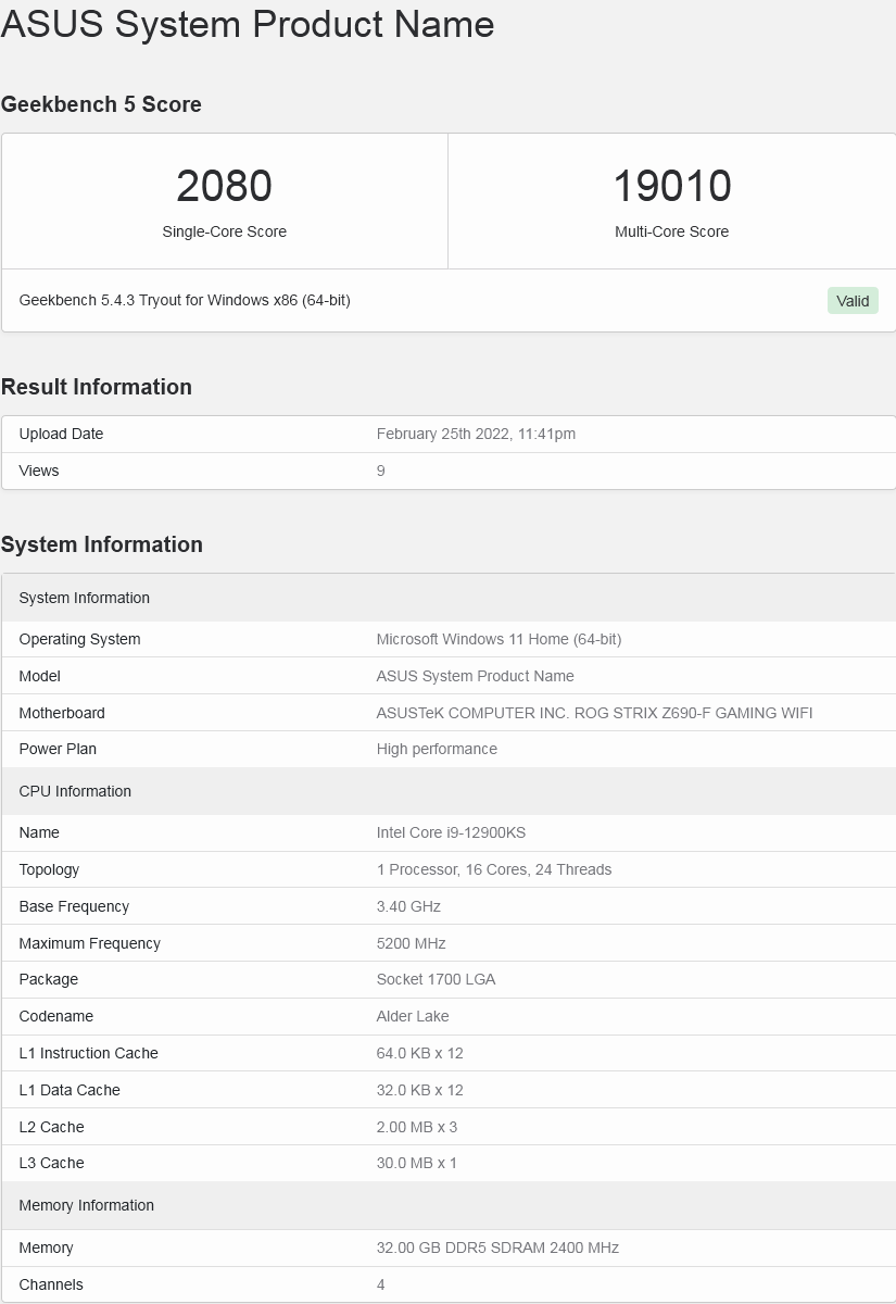 Принцип «процессорной селекции» используется компанией давно, и в рамках семейства Alder Lake-S должен позволить ей выпустить процессор Core i9-12900KS, обладающий повышенными номинальными частотами. По сравнению с Core i9-12900K, базовая частота должна вырасти с 3.2 до 3.4 ГГц, а максимальная – с 5.2 до 5.5 ГГц. В базе данных Geekbench 5 новинка уже отметилась в сочетании с материнской платой ASUS ROG Strix Z690-F Gaming WiFi.