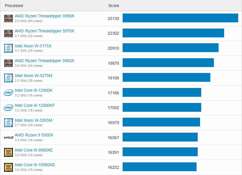 Максимальная оценка многопоточной производительности Intel Core i9-12900KS составила 19010 баллов, это очень хороший результат для 16-ядерного процессора — на 10% быстрее варианта K, на 15% быстрее AMD Ryzen 9 5950X и на 4% медленнее 24-ядерного AMD Ryzen Threadripper 3960X.