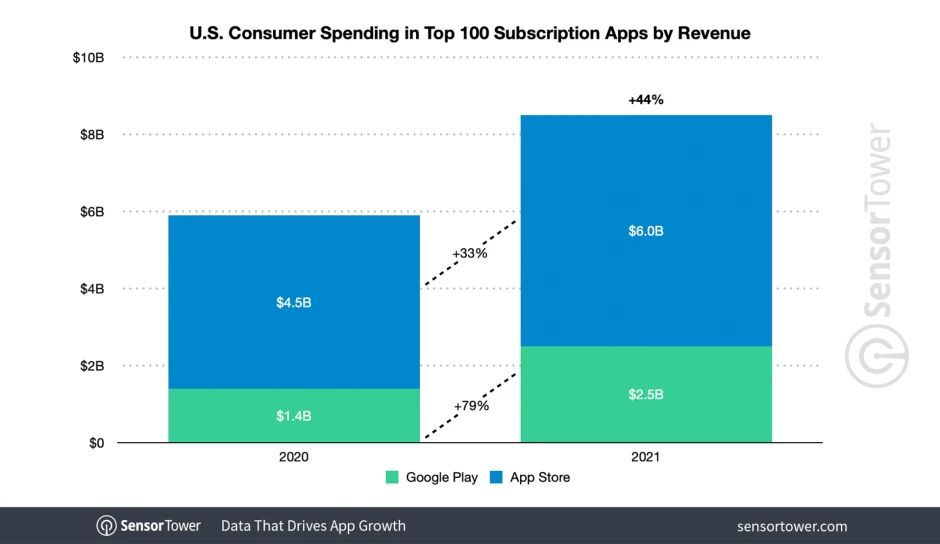 Источником данных стала фирма Sensor Tower. В отчёте говорится о доходе от подписок за 2021 год. Подписки в App Store принесли $13,5 млрд, а в Google Play $4,8 млрд. При этом на Android темпы роста расходов пользователей выше.