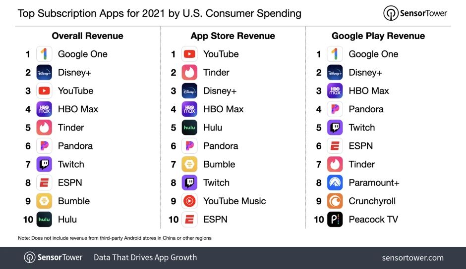Что касается отдельных приложений, Alphabet (материнская компания Google) находится наверху списка с YouTube в App Store и Google One в Google Play Store. YouTube принёс создателям $1,2 млрд, а Google One $1,1 млрд.