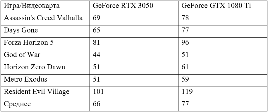 Если перейти к ценам, то GeForce RTX 3050 можно встретить в рознице от 60 до 80 тысяч рублей, поэтому мы остановимся на среднем показателе в 70 000. GeForce GTX 1080 Ti можно встретить только на Авито и стоит она от 50 до 60 тысяч. Предположим, что в вашем городе предложений мало, поэтому давайте исходить из максимальной суммы. Ниже таблица со средними показателями по нескольким актуальным играм.