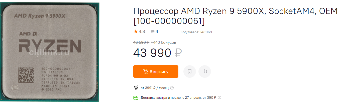 Ну и к категории субфлагманов относится Ryzen 9 5900X. Ещё недавно его рекомендованная цена находилась на отметке 50 000 рублей, а сегодня он стоит всего 44 тысячи. Процессор крайне пластичен, а значит вместе с быстрой оперативной памятью и мощной системой охлаждения способен дать вам огромную производительность. В то же время, если у вас уже есть системный блок с материнской платой на чипсете B450, то вы можете просто заменить сам процессор, получив огромный буст с минимальными затратами.