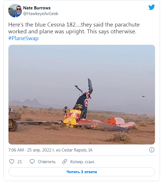 В то время как Эйкинсу удалось переместиться в машину напарника, синий самолет, который он покинул за несколько минут до этого, начал вращаться по спирали, (как показано на видео выше). Фаррингтону пришлось приземлиться с помощью парашюта, а самолет, который "вошел в штопор, разбился", о чем сообщил пользователь Twitter.