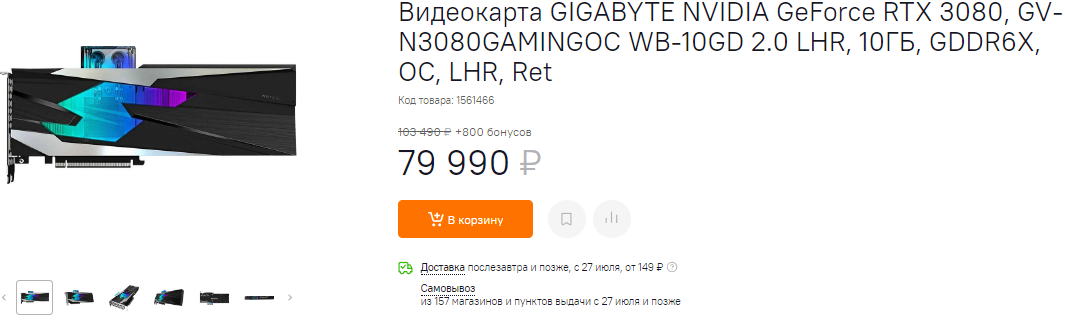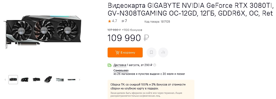 Цена снизилась до 109,990 рублей, достойная система охлаждения, огромный потенциал в любых задачах, 384-битная шина видеопамяти и дополнительный год гарантии при регистрации продукта на сайте Gigabyte. Ранее очень заманчивым предложением выглядела модель: MSI NVIDIA GeForce RTX 3080