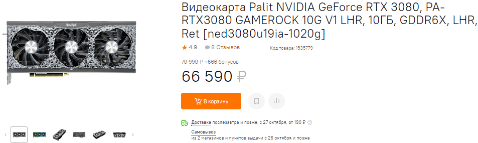 RTX 3090, с начала марта до конца октября подешевела на 400 тыс. рублей. Топовую GeForce RTX 3080 в новом состоянии сегодня можно найти всего за 80 тыс. рублей, а подержанная версия на Avito и подобных площадках обойдётся ещё дешевле (около 60-65 тыс. рублей в зависимости от состояния и конкретного продавца).