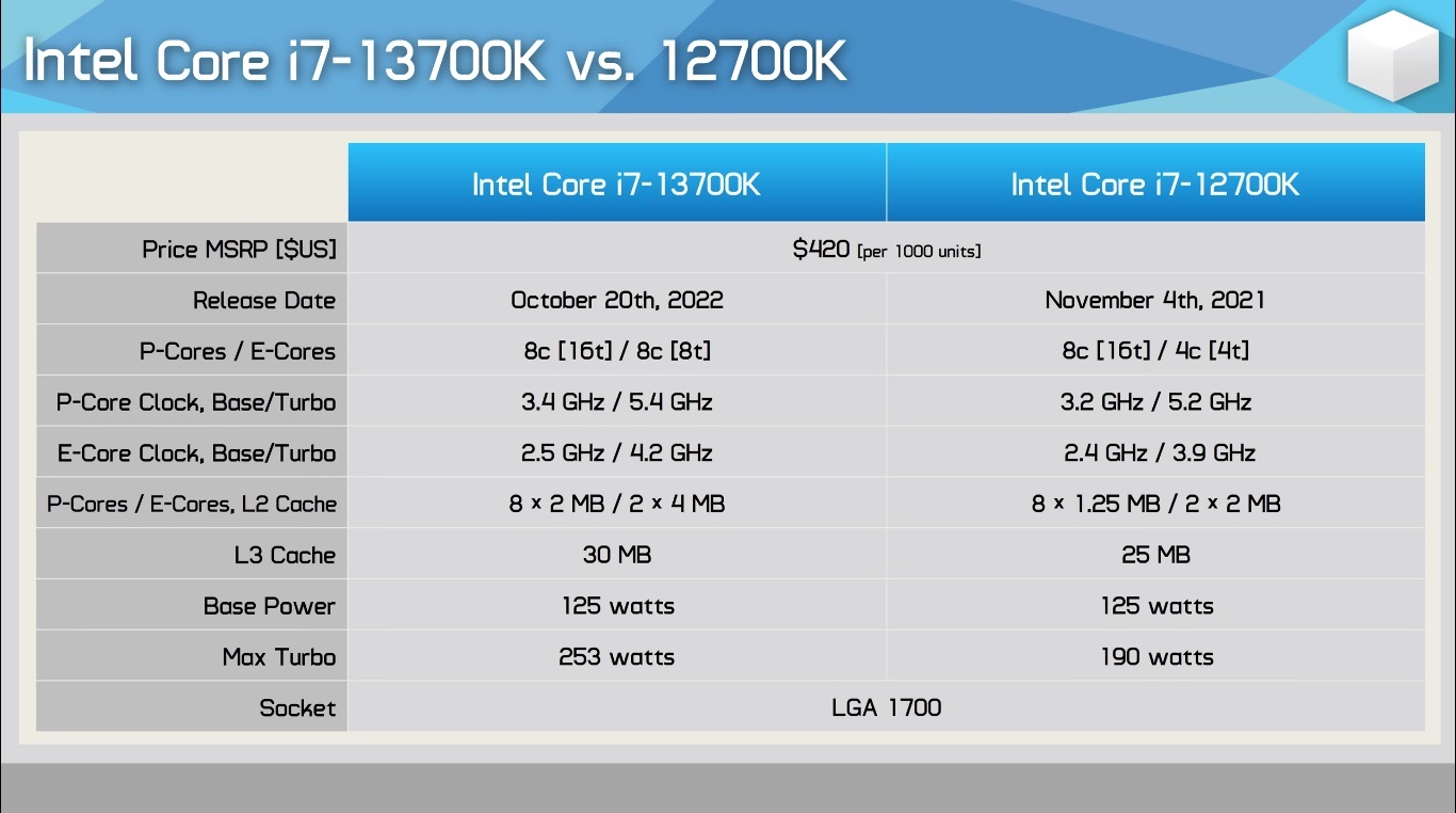 В начале видео автор отмечает улучшения, которые получил процессор Intel i7-13700K по сравнению со своим предшественником i7-12700K. Это и возросшая до 5,4 ГГц частота в режиме Boost, и увеличенный объём кеш-памяти уровней L2 и L3, у удвоенное количество энергоэффективных ядер.
