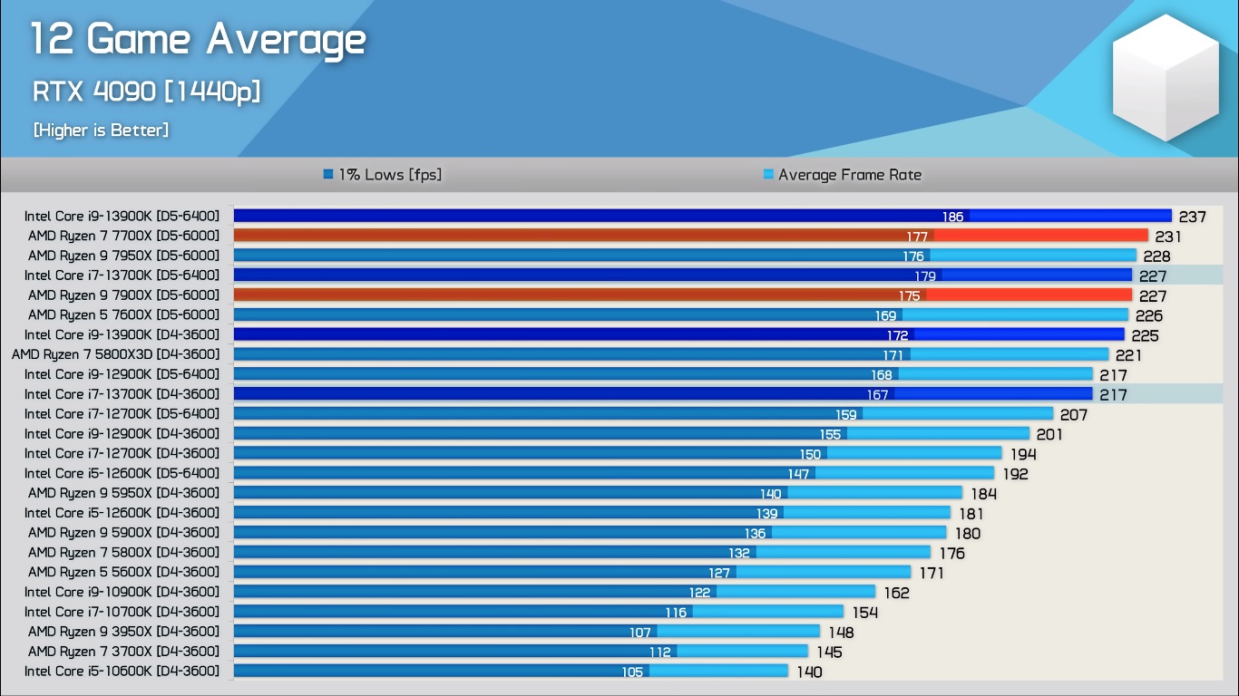 Youtube-канал Hardware Unboxed решил сравнить новейшие процессоры Intel i7-13700K и AMD Ryzen 7 7700X, как в играх, так и в синтетических бенчмарках. Тестирование проводилось в паре с видеокартой NVIDIA RTX 4090 в разрешении 1080p и 1440p.