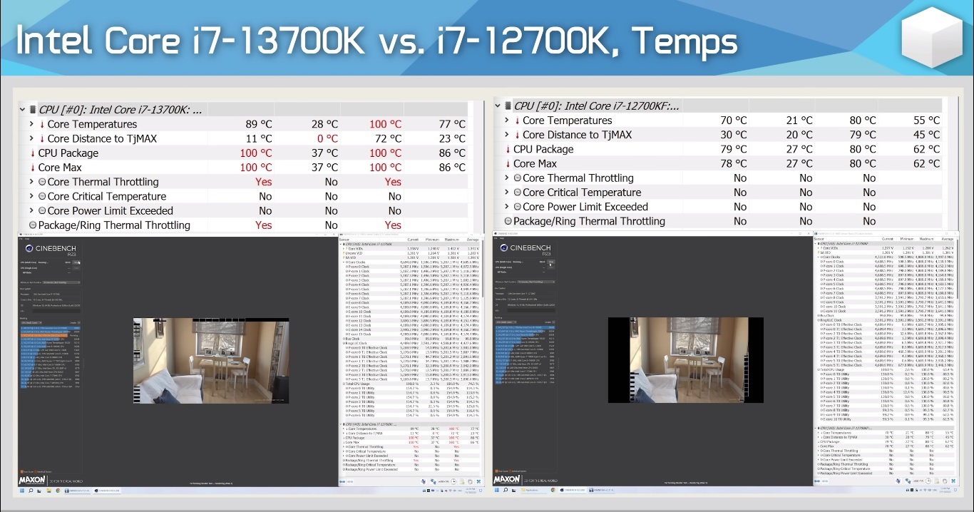Температурные показатели i7-13700K при охлаждении AIO по сравнению с предыдущей моделью i7-12700K не продемонстрировали улучшений. Если последний в пике достигал лишь 80 градусов Цельсия, то новинка в пике достигала 100 градусов.