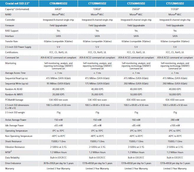 Только вчера компания Crucial сообщила, что продажи накопителей серии M4 начались. Они построены на базе 25 нм твёрдотельной памяти типа MLC, выпускаемой материнской компанией Micron. Судя по всему, в качестве контроллеров используются изделия Marvell, поскольку для старших моделей M4 заявлены скорость чтения на уровне 415 Мбайт/с и скорость записи на уровне 260 Мбайт/с. По быстродействию накопители серии M4 превосходят предшественников на 17-20%. Поддерживаются интерфейс SATA-600 и функция TRIM.