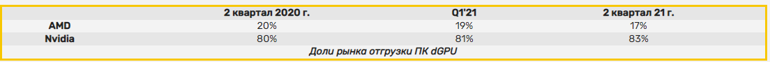 Согласно аналитическим данным Jon Peddie Research, во втором квартале 2021 года поставки графических процессоров достигли 123 миллиона единиц. Учтите, что речь идёт исключительно о видеокартах для настольных компьютеров и ноутбуков, в то время как рынок смартфонов и планшетов тоже растёт. Если перевести эти миллионы в проценты, то окажется, что NVIDIA и AMD реализовали на 3.4% видеокарт больше по сравнению с 1 кварталом и на 37% больше, чем за отчётный период 2020 года. Цифры весьма внушительны, поскольку отражают стабильный рост сектора настольной графики. В данном случае стоит отметить, что львиную долю рынка на себя взяла NVIDIA. По итогам второго квартала AMD занимает 17%, и продолжает терять реальные продажи.