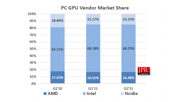 Компания Jon Peddie Research (JPR), занимающаяся исследованием рынка компьютерного оборудования, вчера опубликовала отчет, в котором подробно рассказывается о поставках процессоров и графических процессоров за второй квартал 2021 года. Согласно его данным, поставки графических процессоров увеличились на 37% по сравнению с аналогичным периодом прошлого года, достигнув 123 миллионов единиц в этом году. Это составляет 3,4% роста в квартальном исчислении по сравнению с первым кварталом 2021 года.