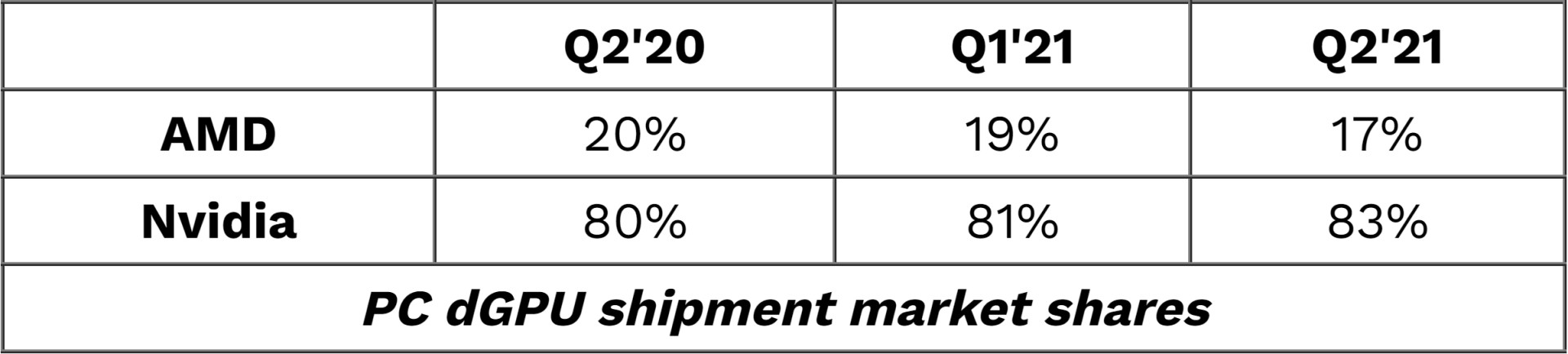 По сути, Nvidia поставила в пять раз больше дискретных видеокарт по сравнению с тем, что AMD удалось за последний квартал, что, безусловно, вызывает беспокойство для большинства, поскольку графические процессоры RDNA 2 от AMD, безусловно, выглядят довольно хорошо в целом по сравнению с RTX 3000 от Nvidia.